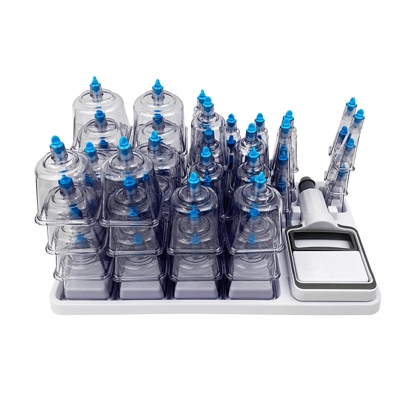 To build complex matrices for your patients, FasciaBuddy Square cups are available as a 20-piece set with 5 different cup sizes, and in expansion packs for when you need more cups of a particular size.